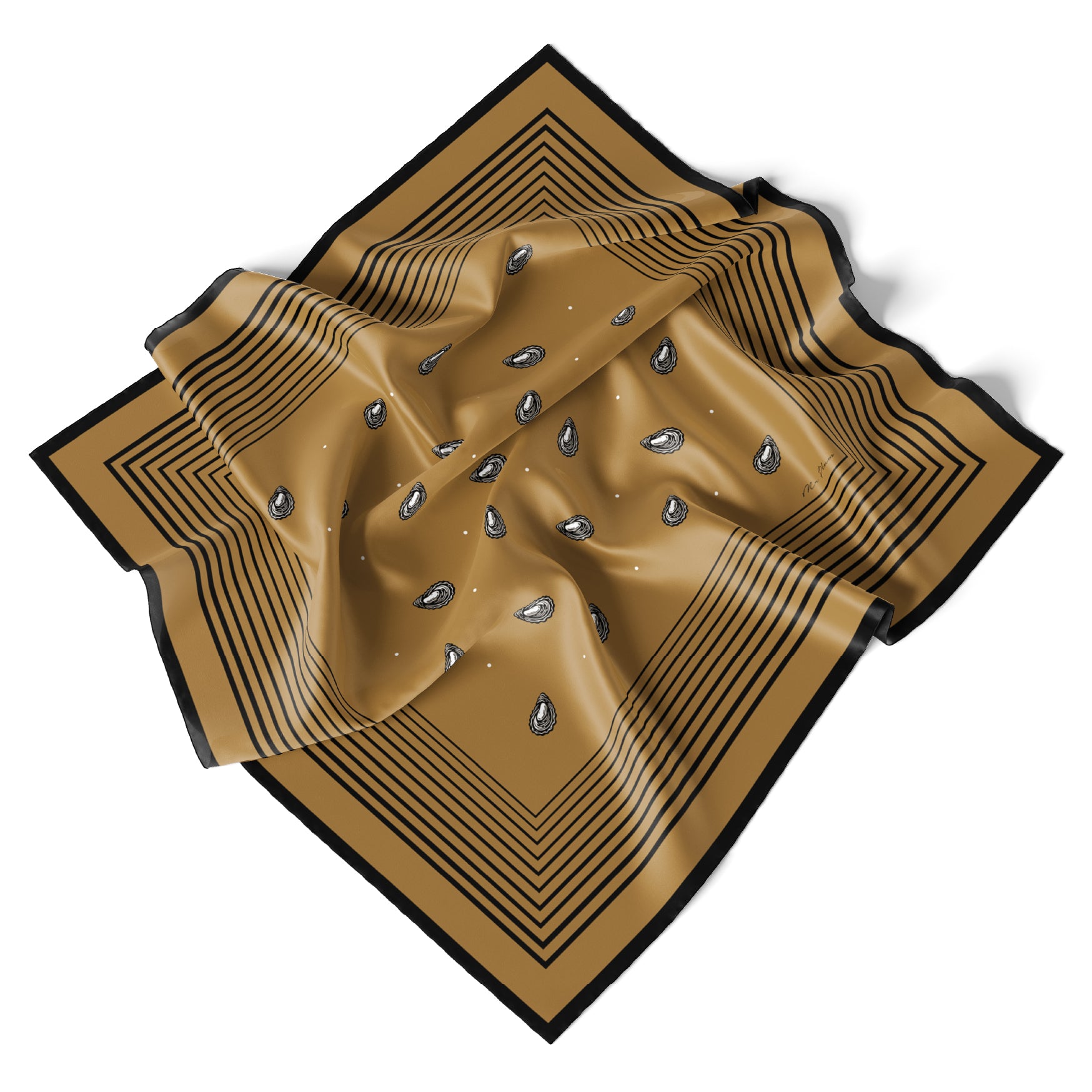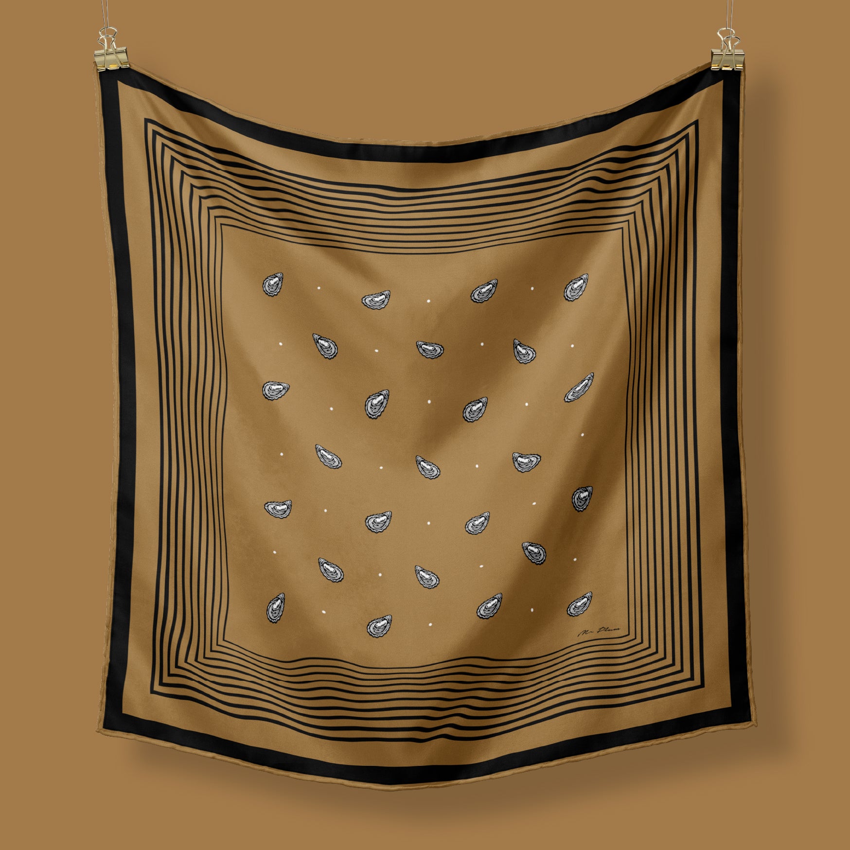 Mr Plum’s Bluff Oysters silk scarf is a love letter to coastal indulgence — featuring hand-drawn oyster illustrations scattered across a warm, earthy caramel base. Framed with bold black borders and clean graphic lines, it’s equal parts playful and refined. Printed on luxurious silk with a soft, fluid drape, this limited-run piece brings a little seaside magic to any outfit. Welcome to the wonderful world of Mr Plum.